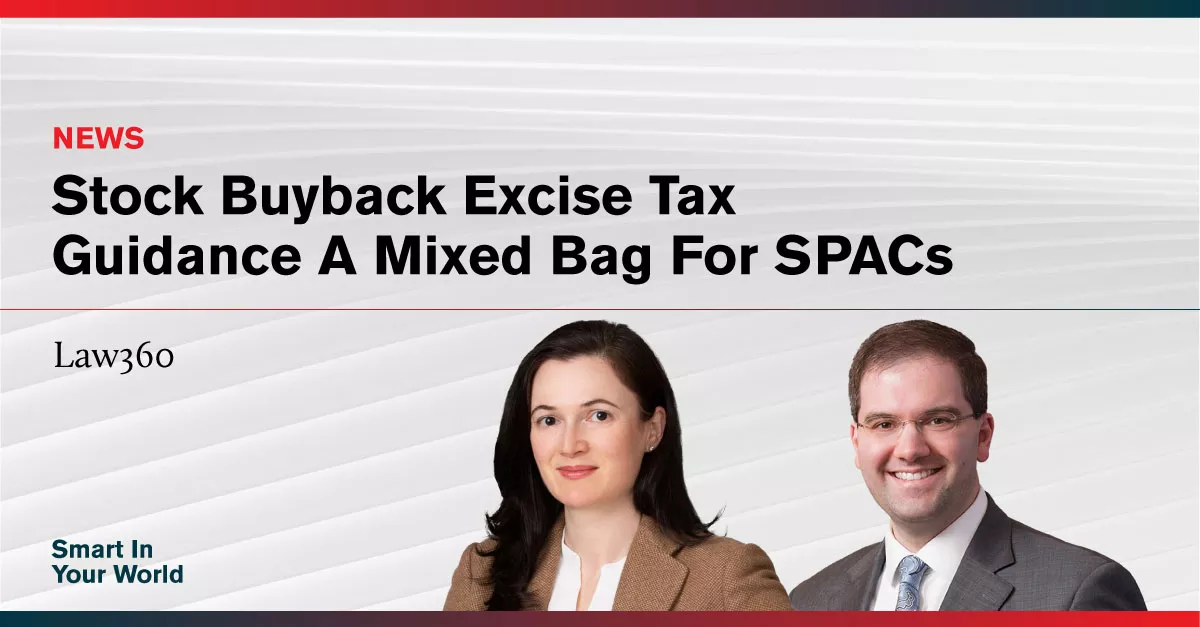 SPACs and their advisers have been watching intently for guidance on the excise tax, which finally arrived on Dec. 27, 2022, mere days before the excise tax was set to take effect in the form of interim guidance from the US Department of the Treasury and the Internal Revenue Service, set forth in Notice 2023-2.