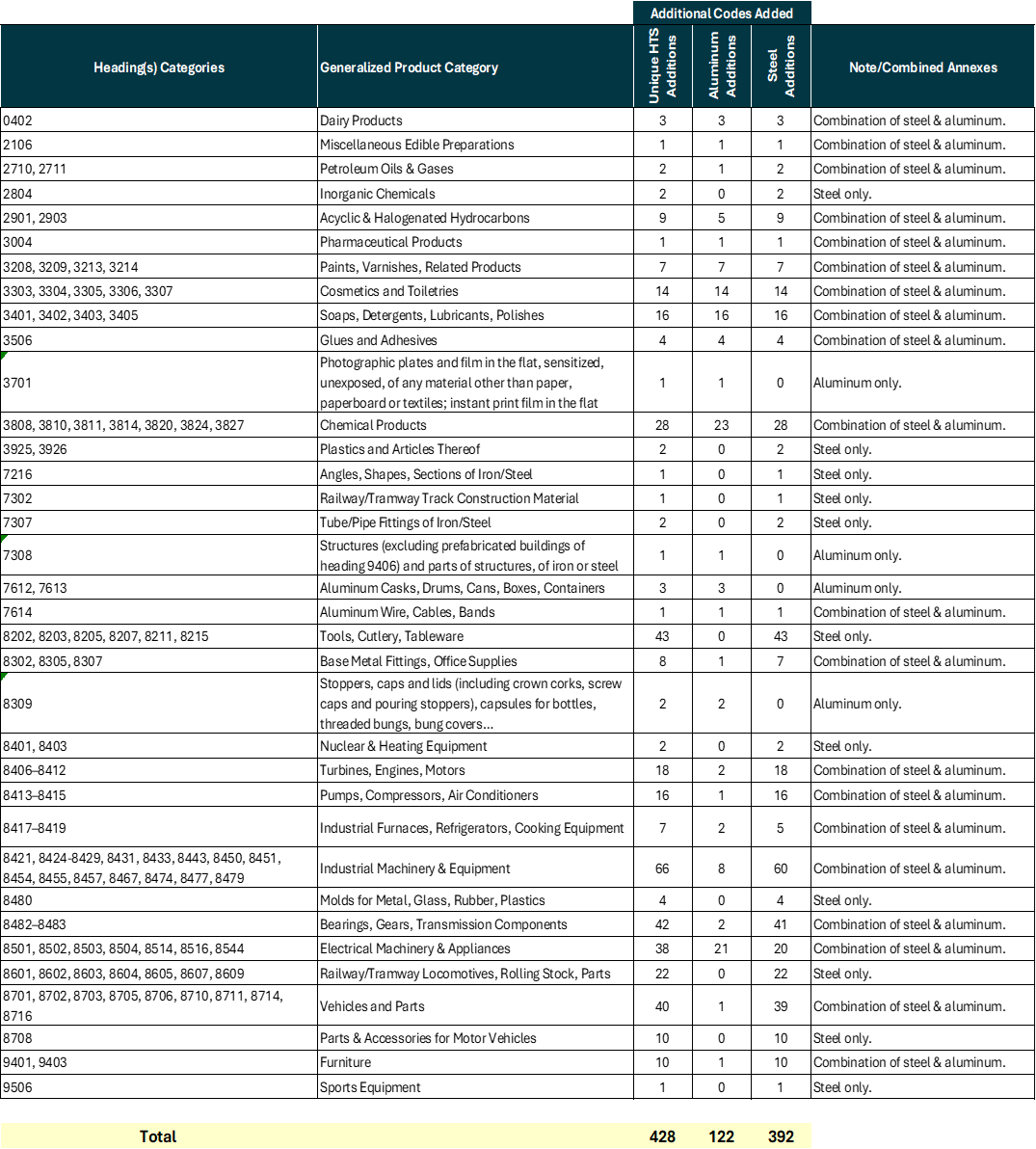 As outlined in the pre-publication Federal Register notice dated August 15, Commerce’s Bureau of Industry and Security (BIS) included 428 Harmonized Tariff Schedule of the United States (HTSUS) codes to the list of steel and aluminum derivative products subject to Section 232 duties. (The final number of new inclusions differs from the widely reported number of 407 Harmonized Tariff Schedule (HTS) inclusions.) This action became effective on August 18, giving importers minimal time to adjust or plan accordingly.