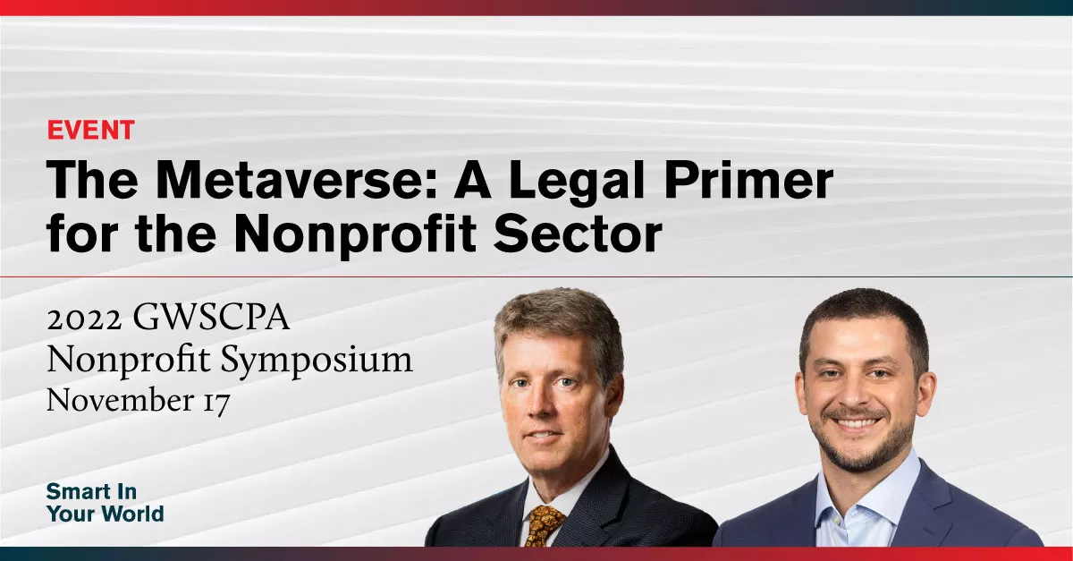 Nonprofits & Associations Industry Group Co-Leader Sean Glynn and Associate Dan Jasnow will present about metaverse considerations for the nonprofit sector at the 2022 Greater Washington Society of CPAs (GWSCPA) Nonprofit Symposium on November 17.