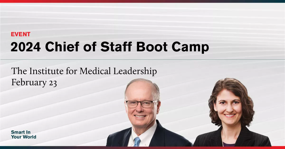 Health Care Partner Lowell Brown and Counsel Sarah Benator will present at The Institute for Medical Leadership’s Chief of Staff Boot Camp in Los Angeles, California, on February 23-25, 2024.