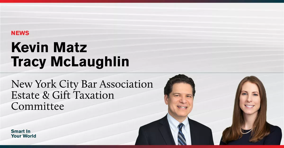 Effective August 1, Partner Kevin Matz will chair the committee, and Associate Tracy McLaughlin will serve as committee secretary. The committee addresses important issues related to estate and gift tax law.
