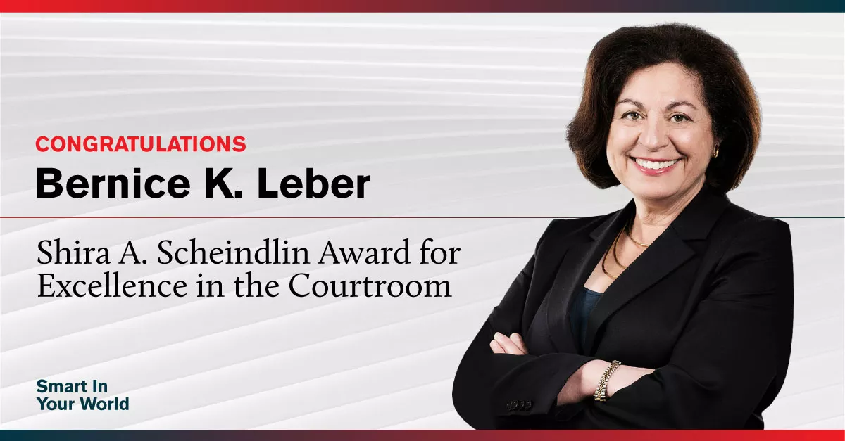 ArentFox Schiff is pleased to announce that Partner Bernice K. Leber has received special recognition that is awarded annually to a female litigator who has distinguished herself in Federal or State Courts in New York and shown a commitment to mentoring young attorneys in the legal community.