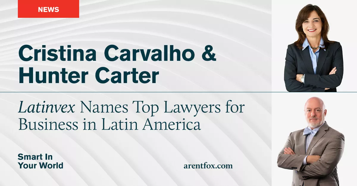 Arent Fox is pleased to announce that Firmwide Managing Partner Cristina A. Carvalho and AF International Co-Leader Hunter T. Carter have once again been named to Latinvex’s Top 100 Lawyers list.